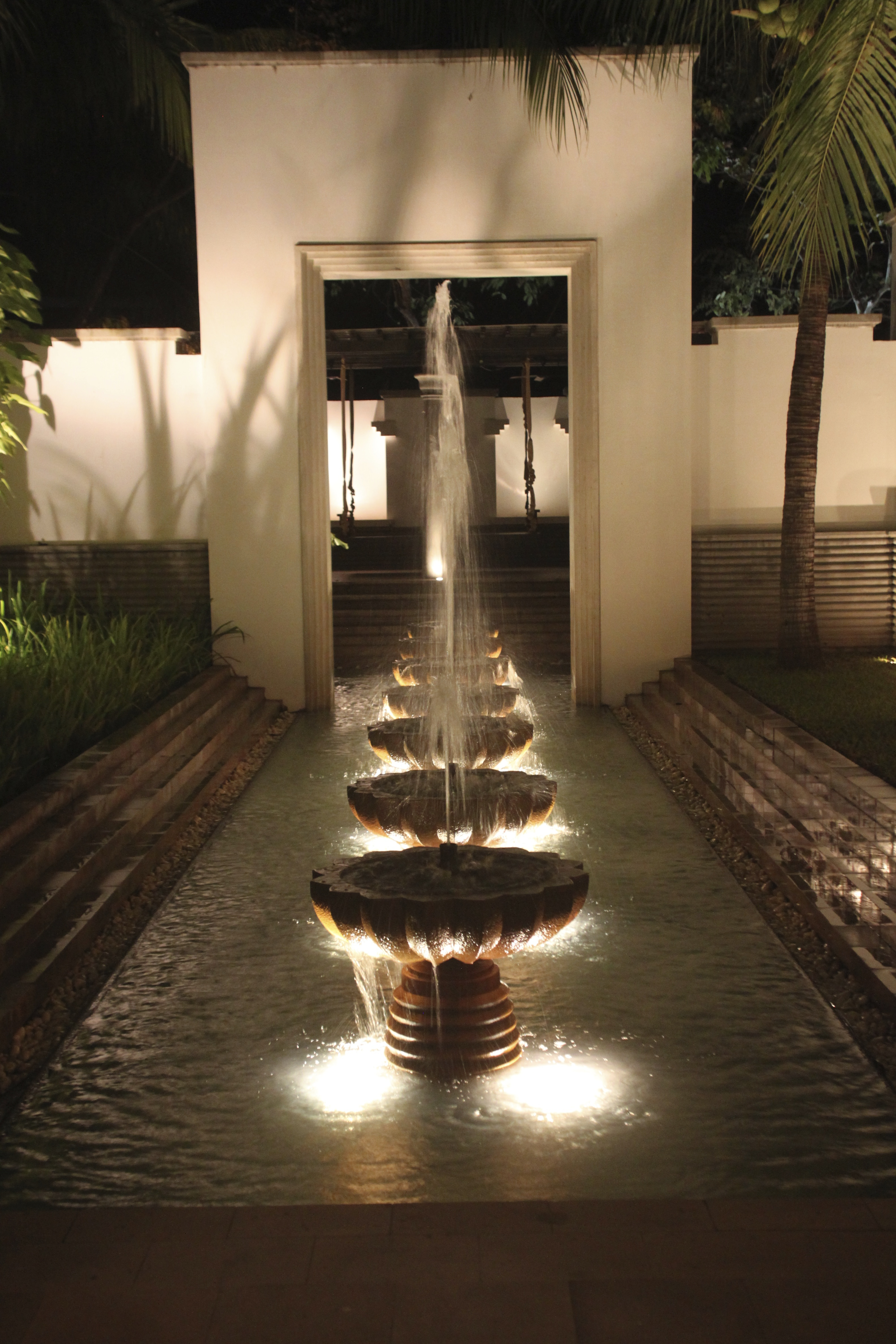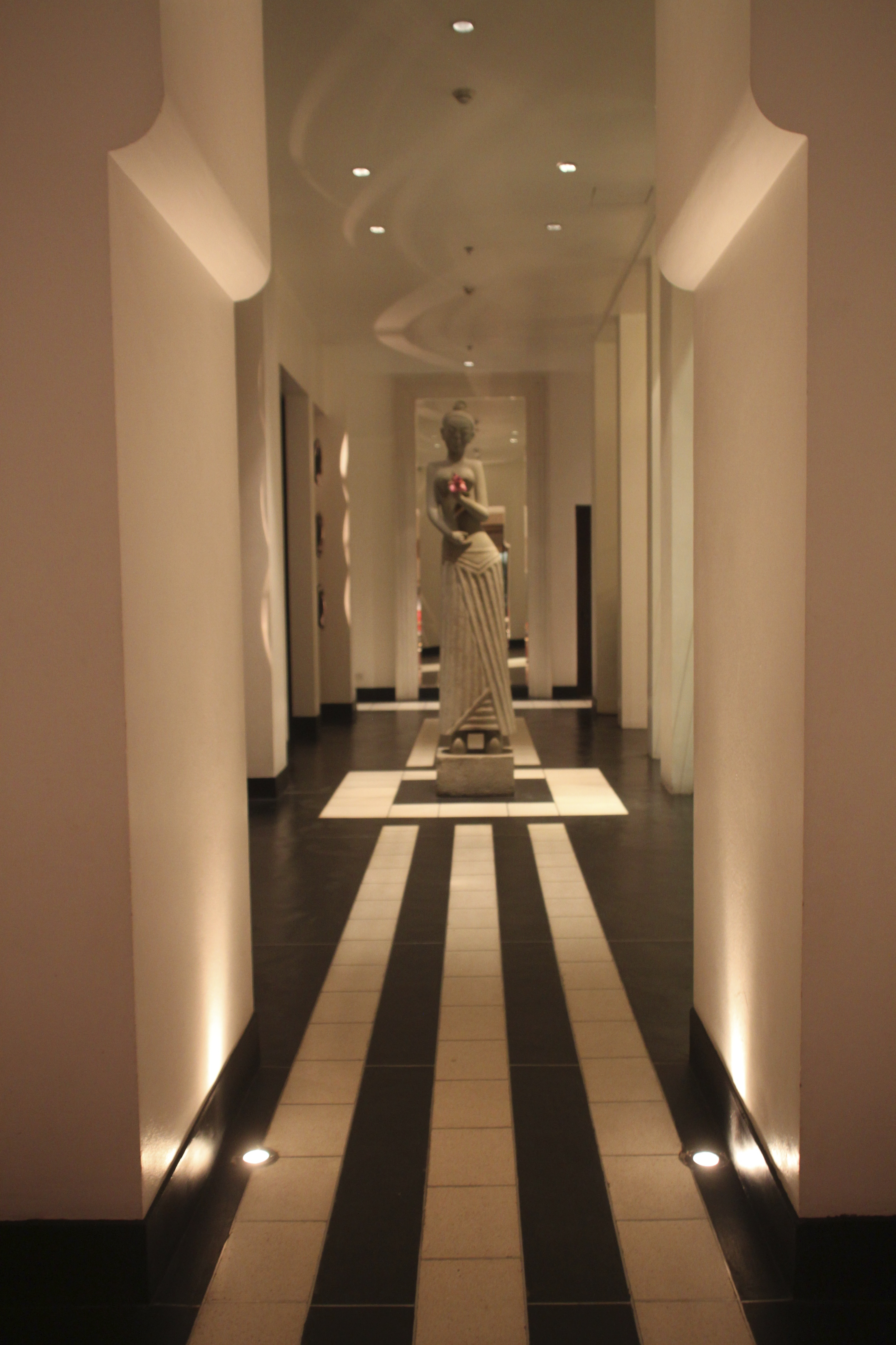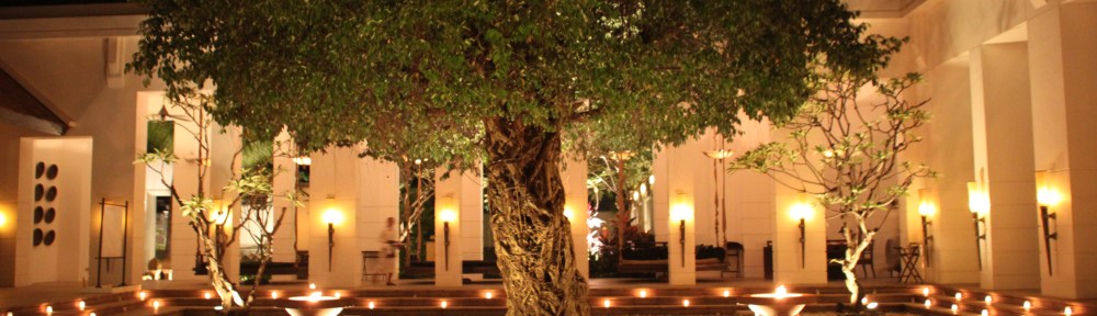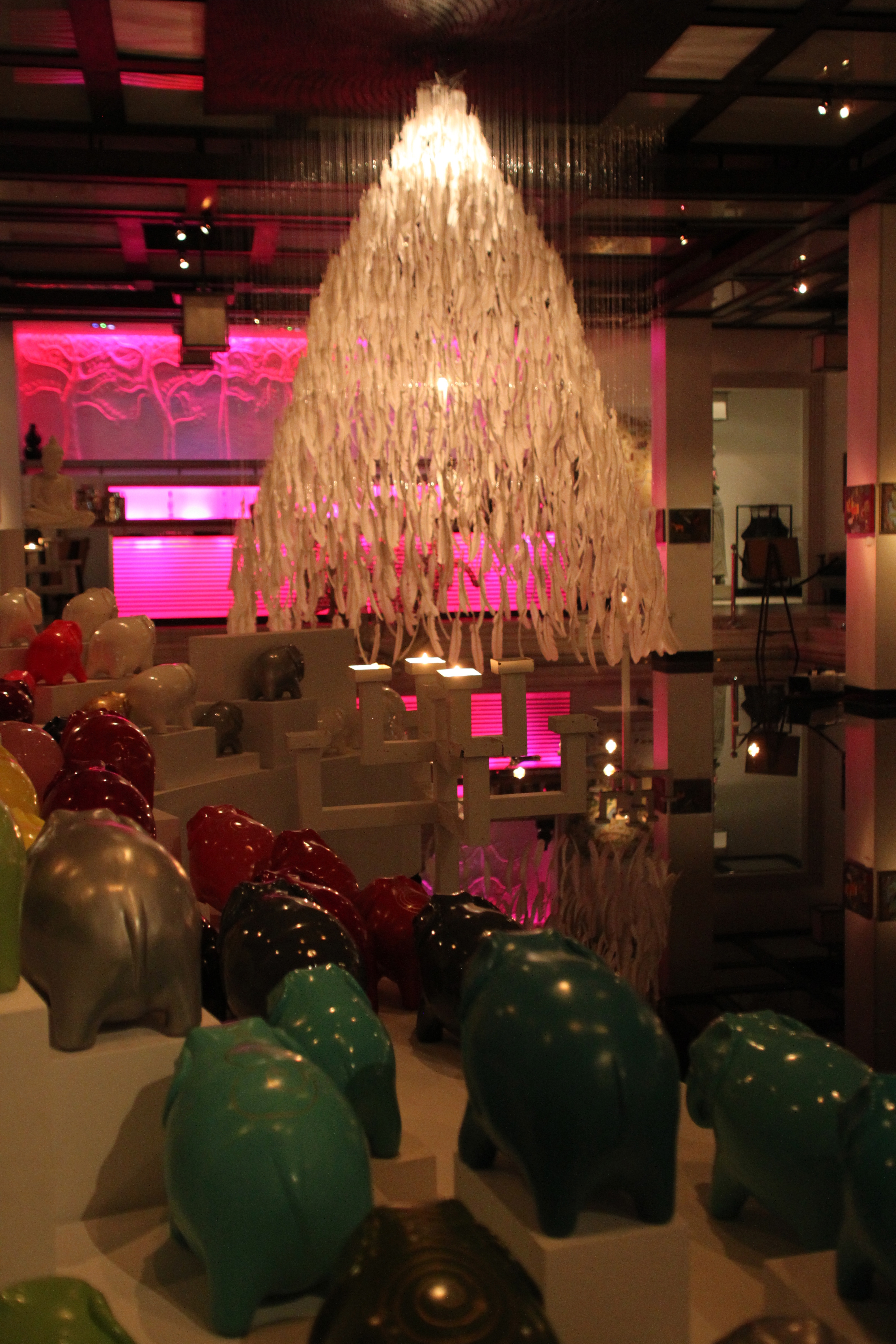 I spent the Christmas Eve 2011 in this hotel, and with a lovely supper in the courtyard with the Christmas tree decoration was the most stunning part of the setting. The Christmas tree and the art installation was already a great view in itself, a tree hanging from the high ceilings made out of white feathers…. surrounded by small elephants and sculptures on the black surface water bassin made a dramatic view. Christmas Eve was even a more dramatic and artistic set up: with 100 ice blocks surrounding the white feather Christmas tree this was an esthetic Christmas gift to all os us attending.