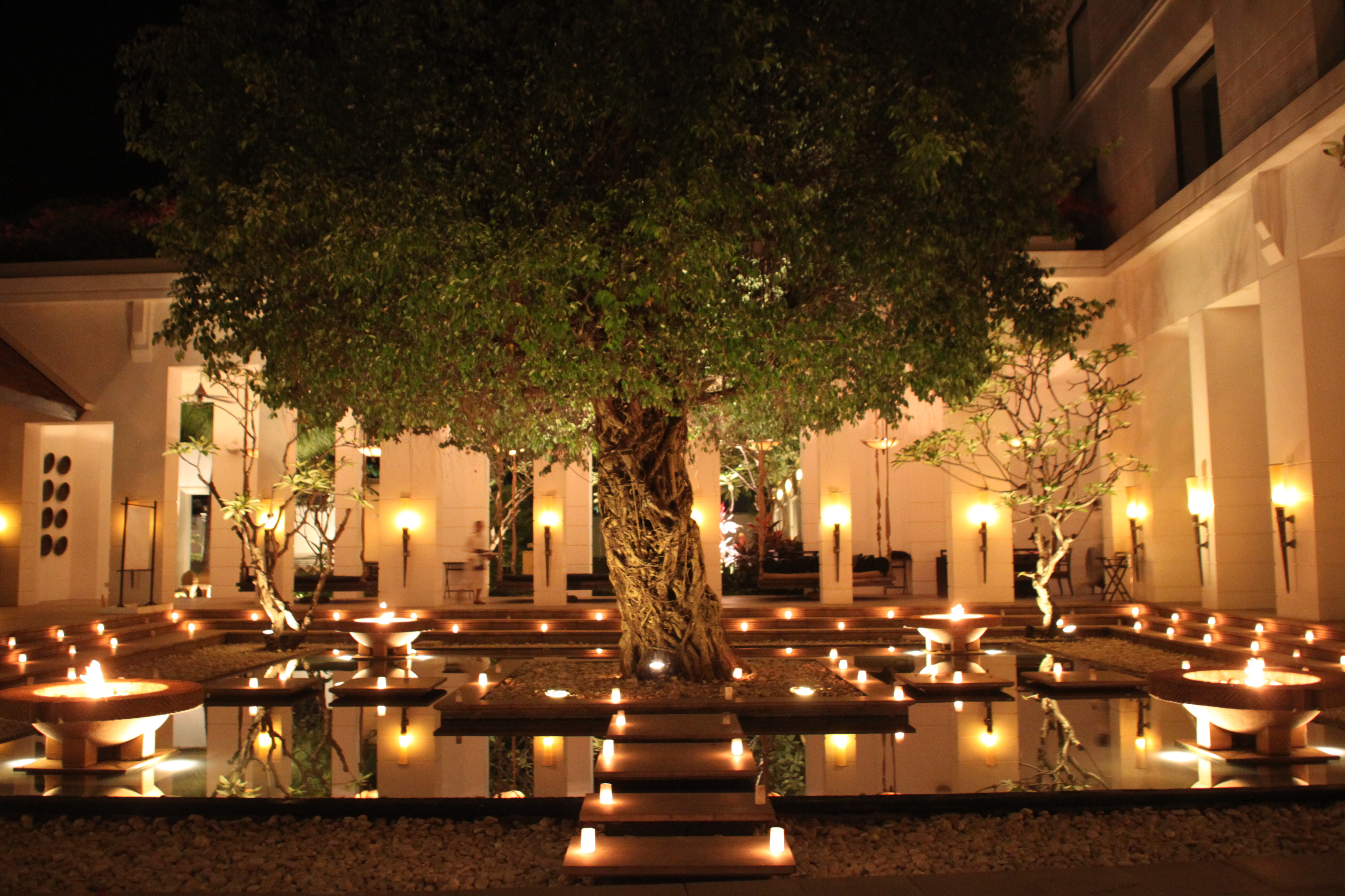 The courtyard is representing the similar to the temples and the water features that you will find in the main temples of UNESCO heritage Angkor Wat. At daytime this courtyard is a relaxing cool oasis and at night time a perfect romantic spot with dramatic open fire and water mirrors. The middle tree gives a peaceful athmosphere.